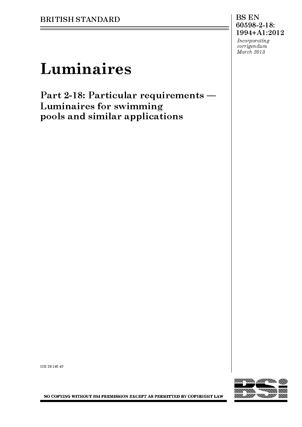 Luminaires Particular requirements. for swimming pools and similar applications