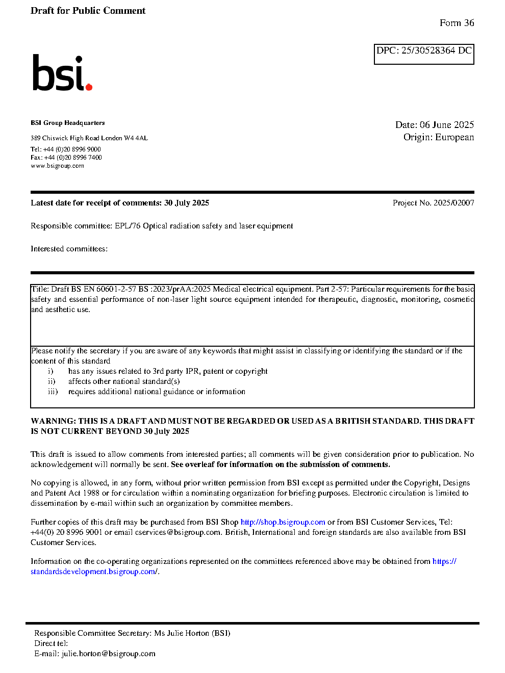 Medical electrical equipment Particular requirements for the basic safety and essential performance of non-laser light source intended therapeutic, diagnostic, monitoring, cosmetic aesthetic use
