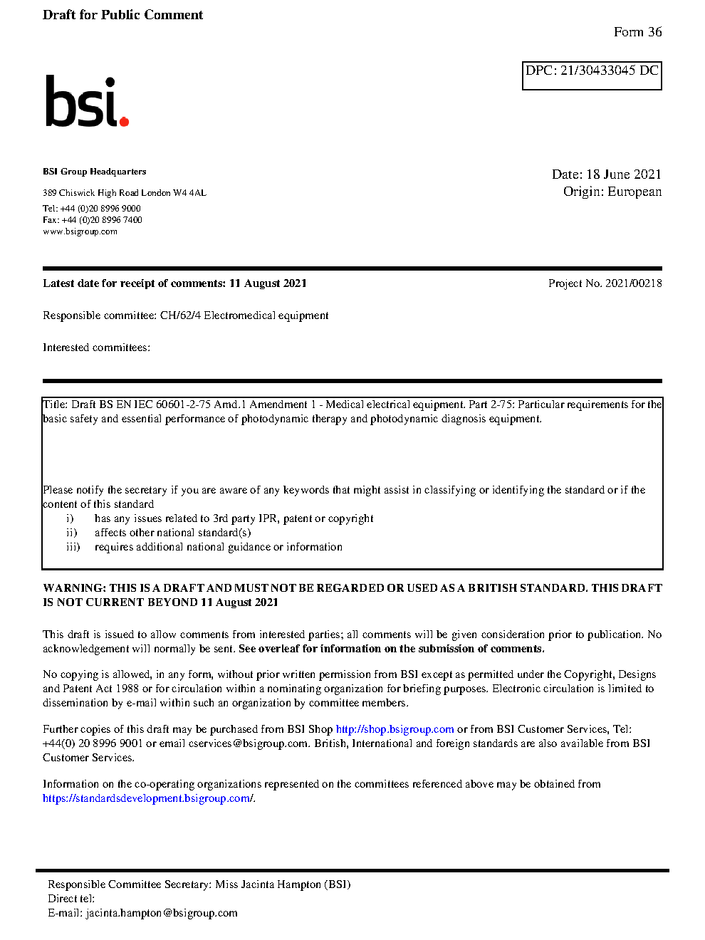Medical Electrical Equipment Particular requirements for the basic safety and essential performance of photodynamic therapy diagnosis equipment