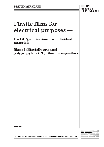 Plastic films for electrical purposes Specifications individual materials. Sheet 1. Biaxially oriented polypropylene (PP) film capacitors