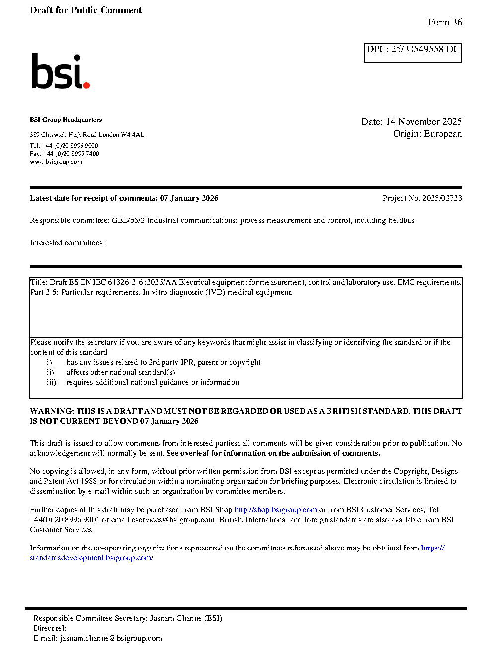 Electrical equipment for measurement, control and laboratory use. EMC requirements Particular requirements. In vitro diagnostic (IVD) medical