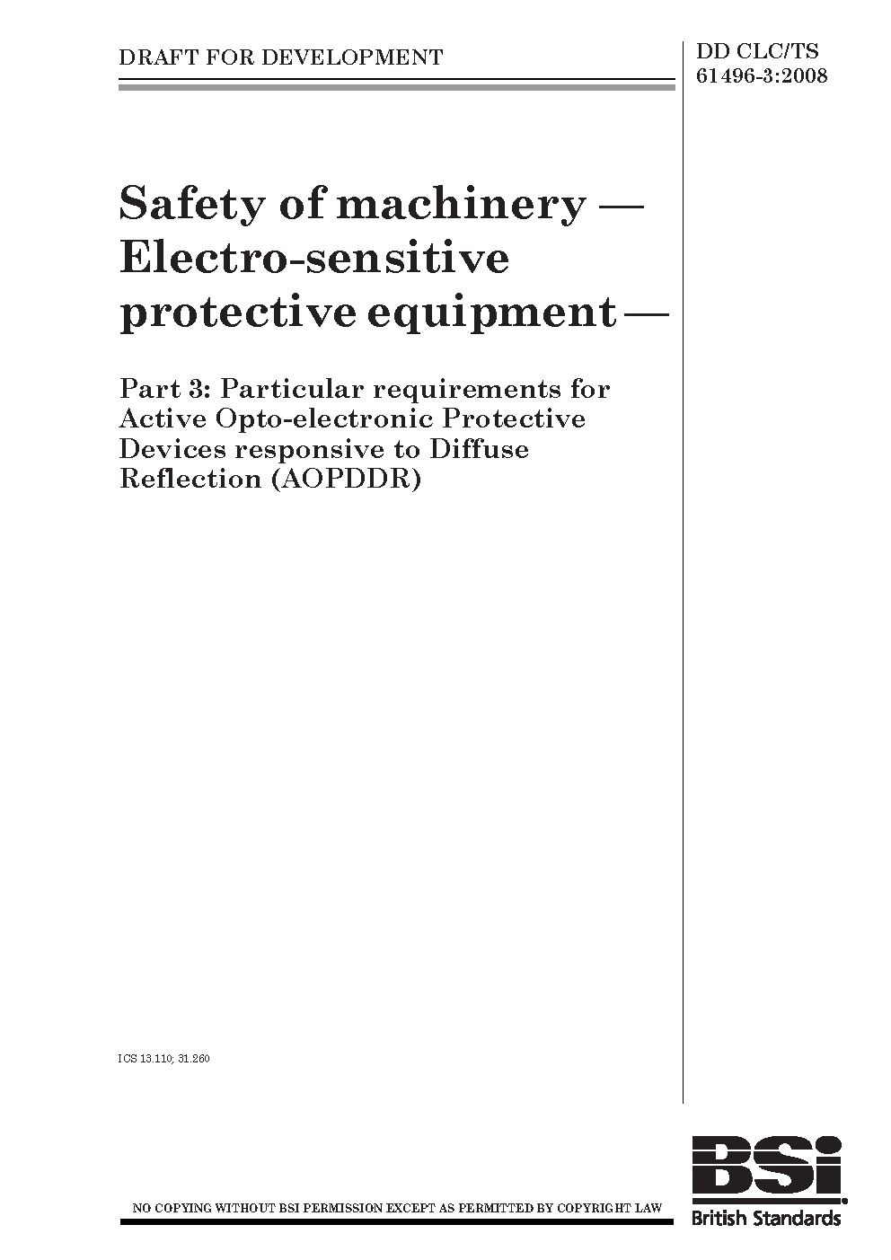 Safety of machinery. Electro-sensitive protective equipment Particular requirements for active opto-electronic devices responsive to diffuse Reflection (AOPDDR)