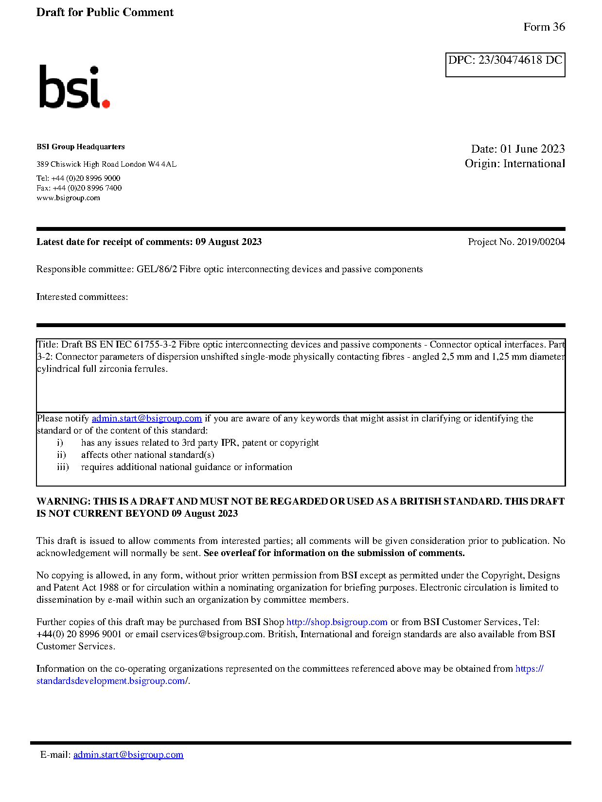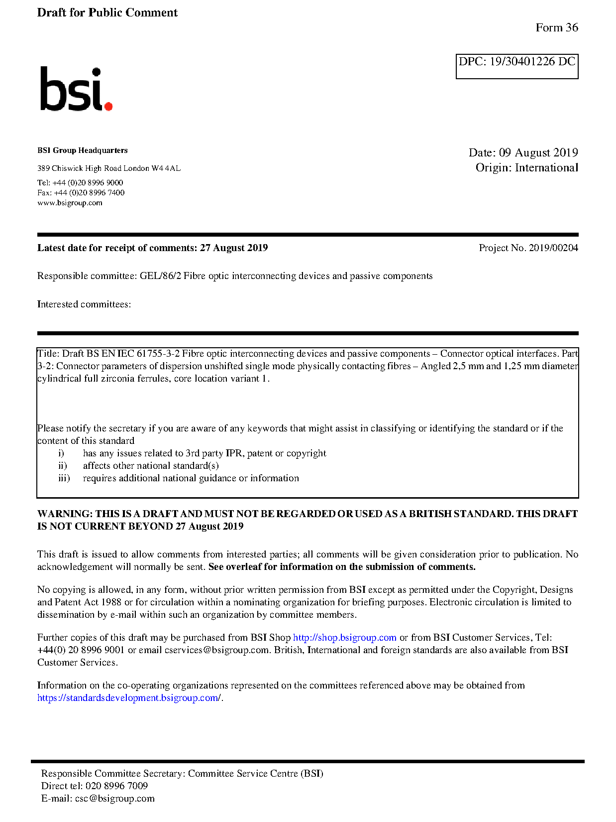 Fibre optic interconnecting devices and passive components. Connector optical interfaces Connector parameters of dispersion unshifted single-mode physically contacting fibres. Angled 2,5 mm 1,25 diameter cylindrical full zirconia ferrules