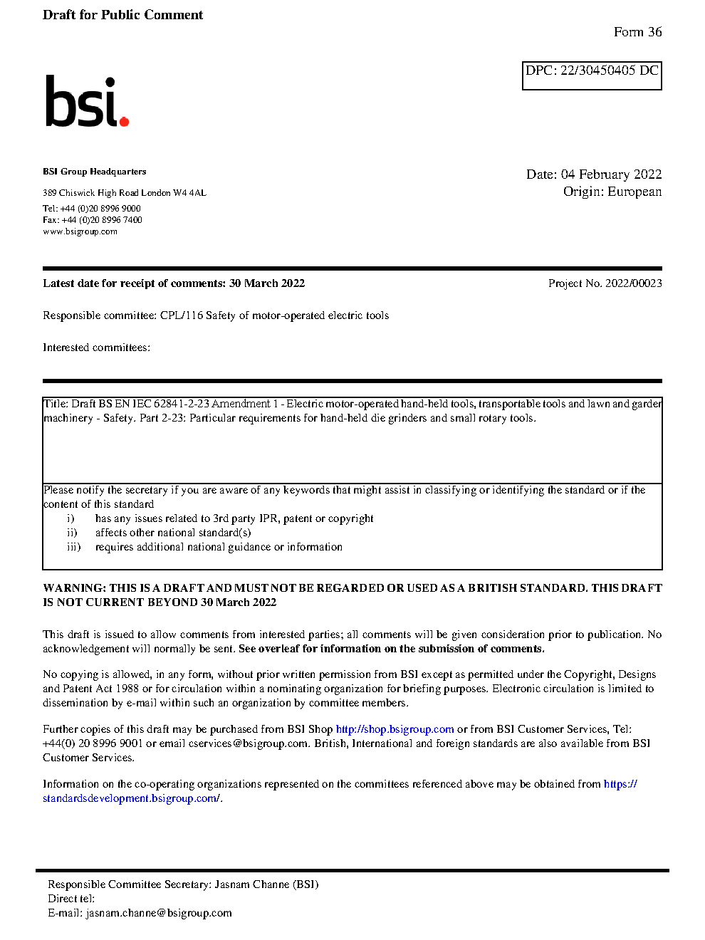 Electric motor-operated hand-held tools, transportable tools and lawn garden machinery. Safety Particular requirements for die grinders small rotary