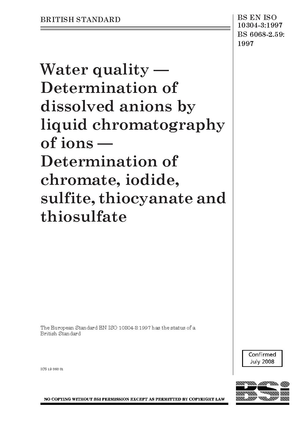 Water quality. Determination of dissolved anions by liquid chromatography ions chromate, iodide, sulfite, thiocyanate and thiosulfate