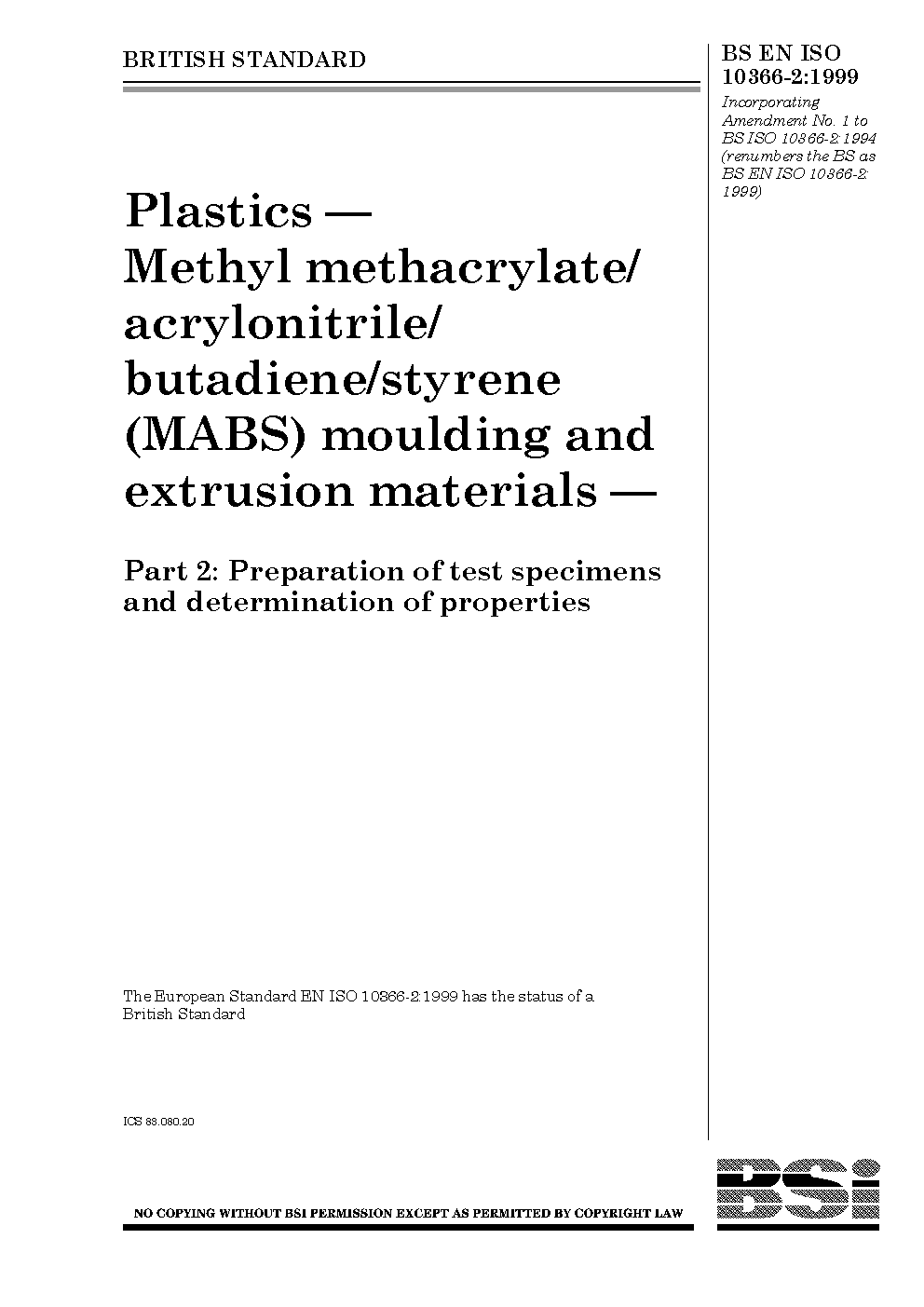 Plastics. Methyl methacrylate-acrylonitrile-butadiene-styrene (MABS) moulding and extrusion materials Preparation of test specimens determination properties