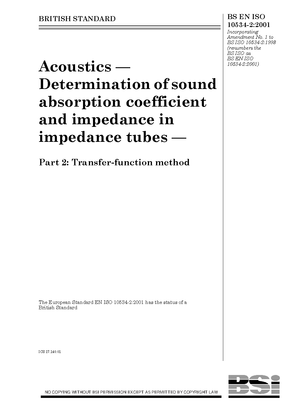 Acoustics. Determination of acoustic properties in impedance tubes Two-microphone technique for normal sound absorption coefficient and surface