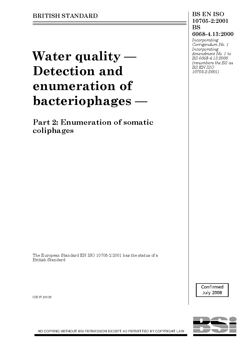 Water quality. Detection and enumeration of bacteriophages Enumeration somatic coliphages