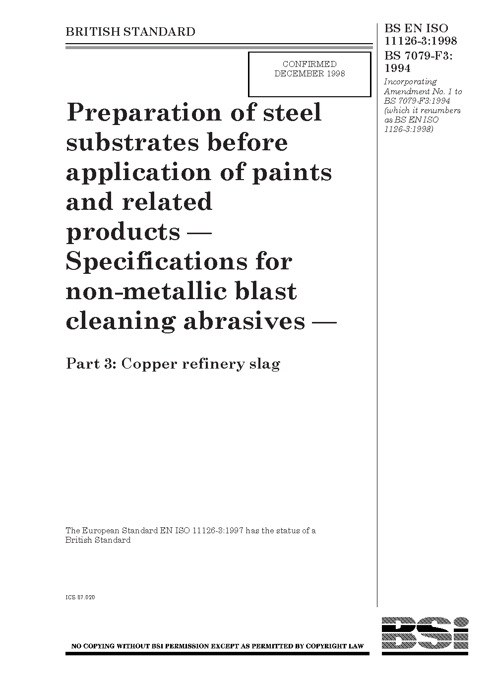 Preparation of steel substrates before application paints and related products. Specifications for non-metallic blast-cleaning abrasives Copper refinery slag