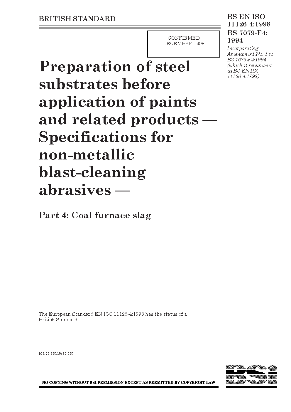 Preparation of steel substrates before application paints and related products. Specifications for non-metallic blast-cleaning abrasives Coal furnace slag