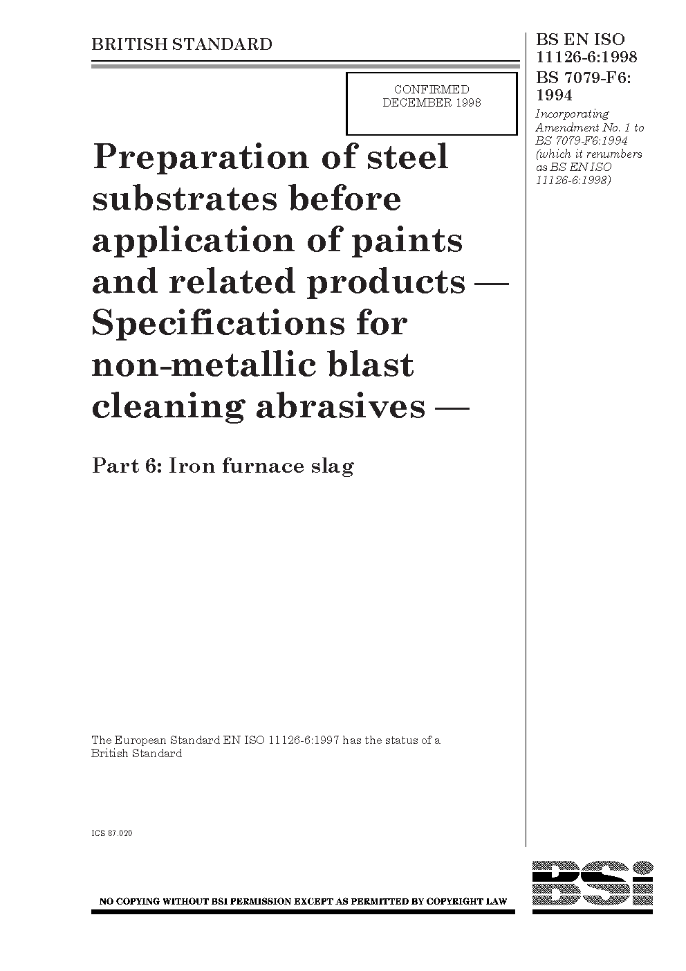 Preparation of steel substrates before application paints and related products. Specifications for non-metallic blast-cleaning abrasives Iron furnace slag
