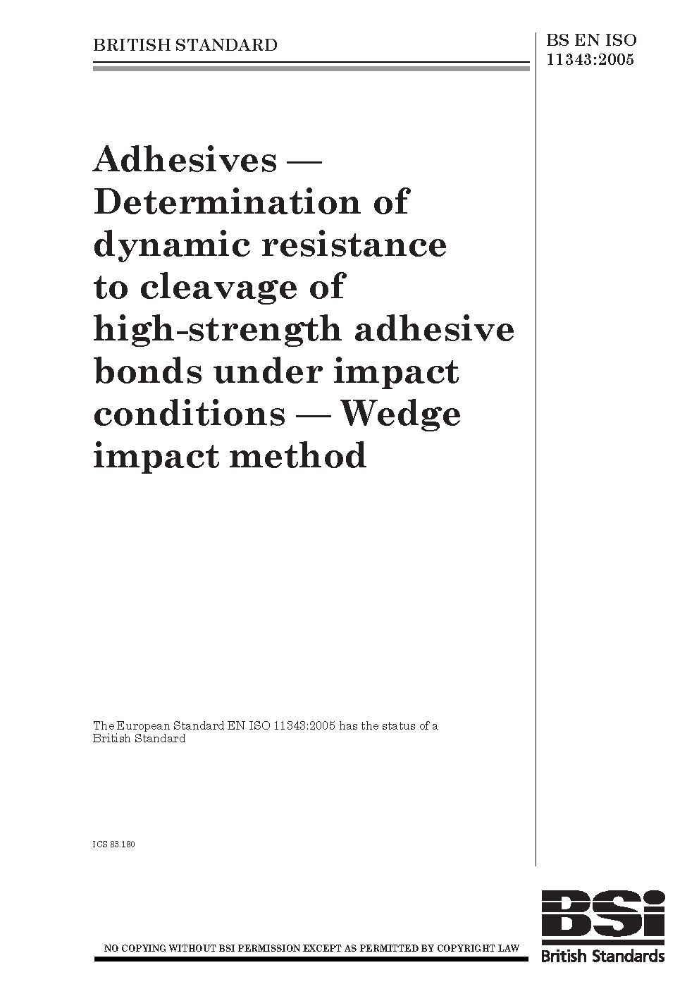Adhesives. Determination of dynamic resistance to cleavage of high-strength adhesive bonds under impact conditions. Wedge impact method