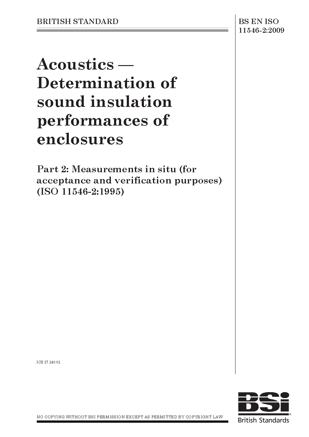 Acoustics. Determination of sound insulation performances enclosures Measurements in situ (for acceptance and verification purposes)