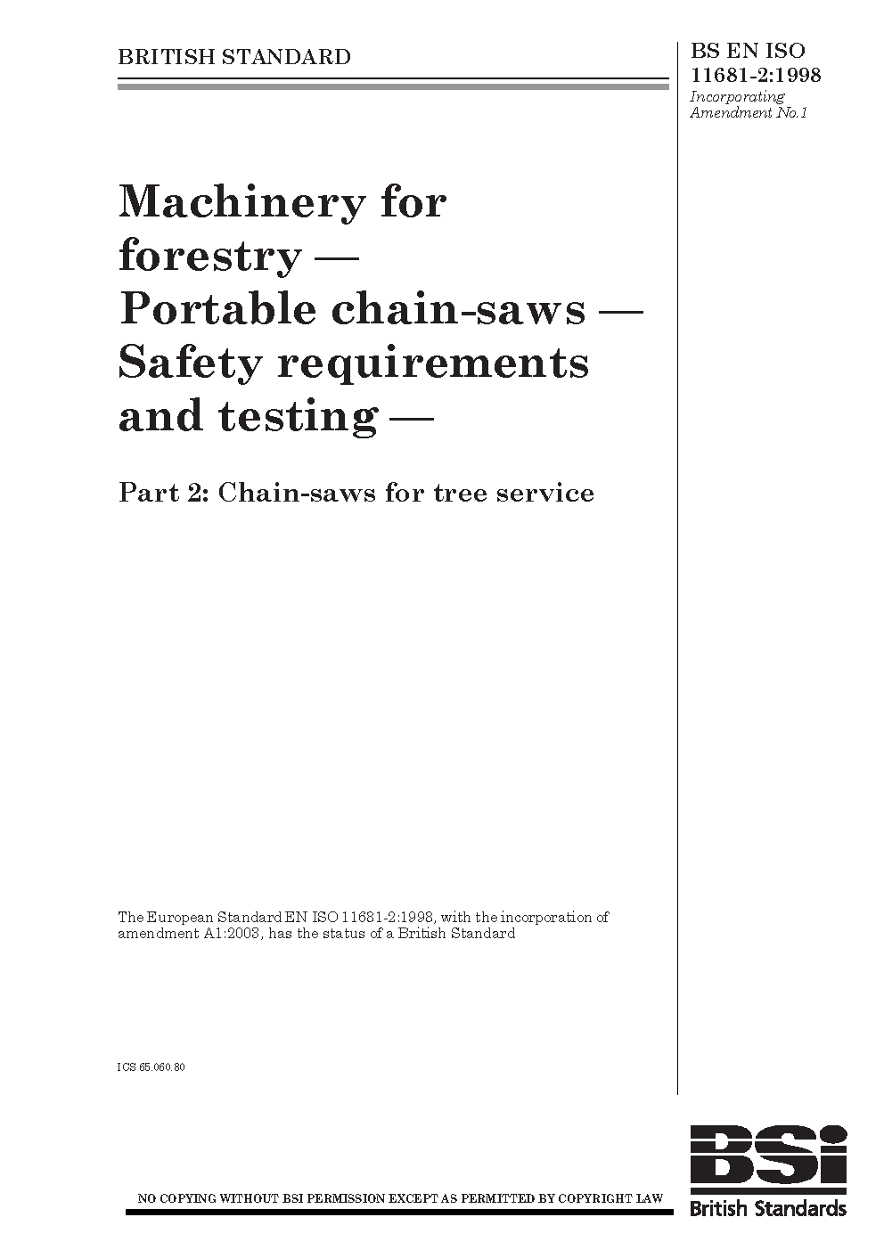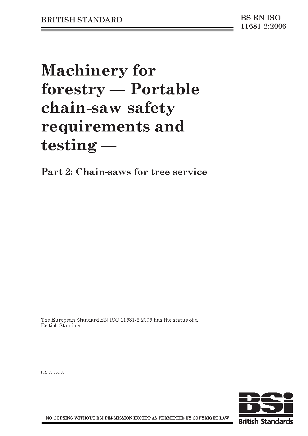 Machinery for forestry. Portable chain-saw safety requirements and testing Chain-saws tree service