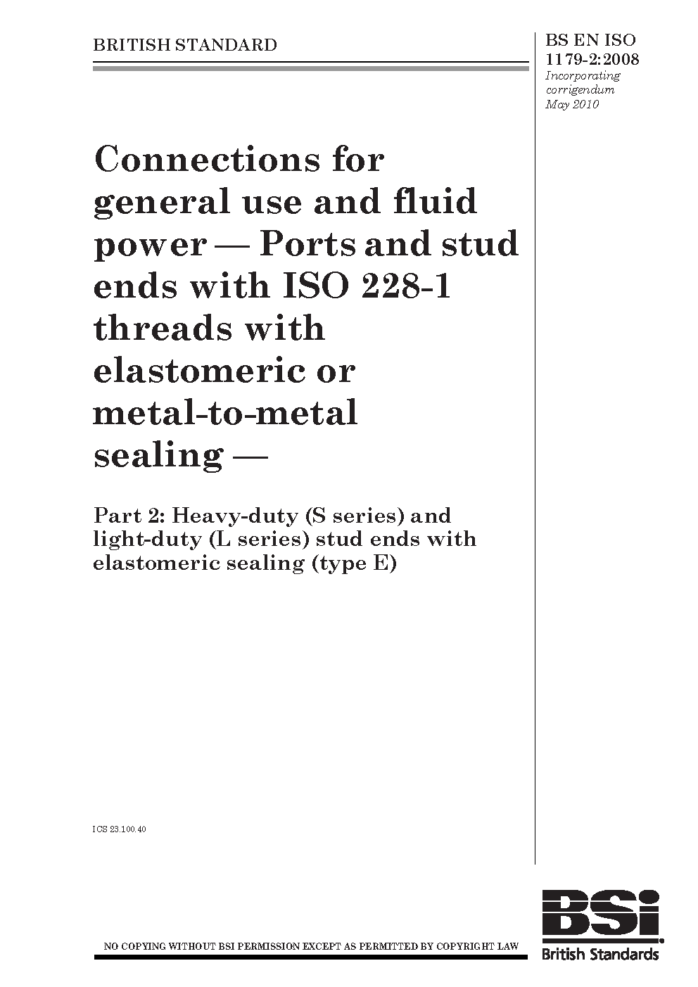 Connections for general use and fluid power. Ports stud ends with ISO 228-1 threads elastomeric or metal-to-metal sealing Heavy-duty (S series) light-duty (L (type E)