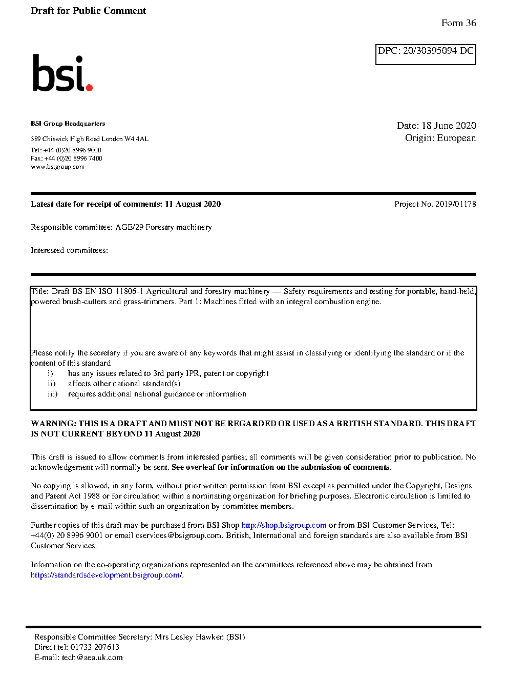 Safety measures;Portable;Agricultural equipment;Instructions for use;Hand tools;Technical documents;Vibration hazards;Hazards;Brush cutters;Equipment safety;Mechanical testing;Forestry equipment;Balancing;Noise (environmental);Starters;Internal combustion engines;Safety devices;Grass trimmers;Machine guards;Design;Exhaust gases;Marking