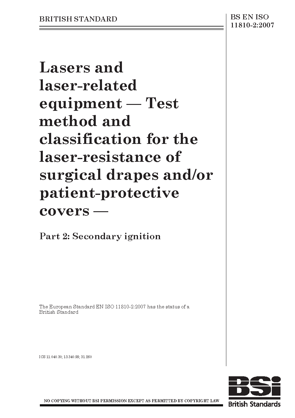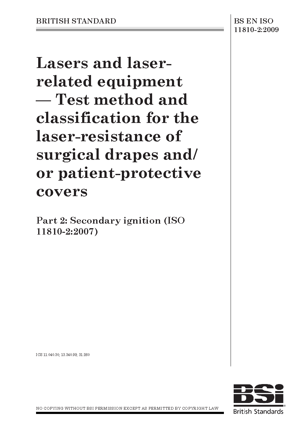 Lasers and laser-related equipment. Test method classification for the laser-resistance of surgical drapes and/or patient-protective covers Secondary ignition
