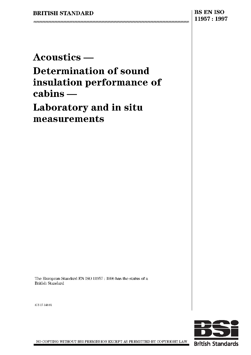Acoustics. Determination of sound insulation performance of cabins. Laboratory and in situ measurements