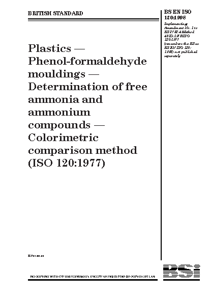 Polymers;Phenol-formaldehyde resins;Moulding (process);Materials in contact with food;Ammonia;Plastics;Corrosive materials;Determination of content;Chemical analysis and testing;Extraction methods of analysis;Aqueous extraction methods;Phenolic resins;Colorimetry;Plastics and rubber technology;Specimen preparation
