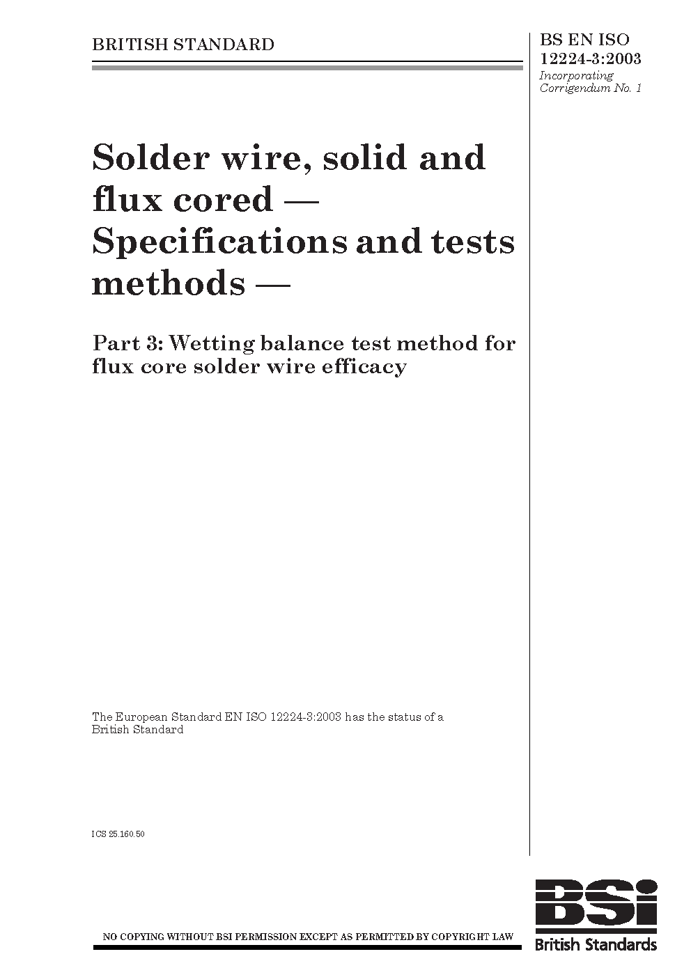 Solder wire, solid and flux cored. Specification test methods Wetting balance method for core solder wire efficacy
