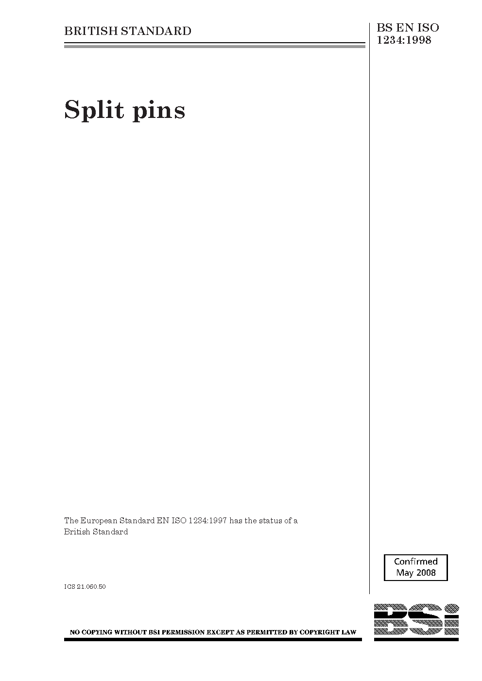 Length;Dimensional tolerances;Alloys;Surface treatment;Ductility;Copper;Split pins;Diameter;Dimensions;Steels;Locking and locating devices;Finishes;Designations;Aluminium;Fasteners;Preferred sizes