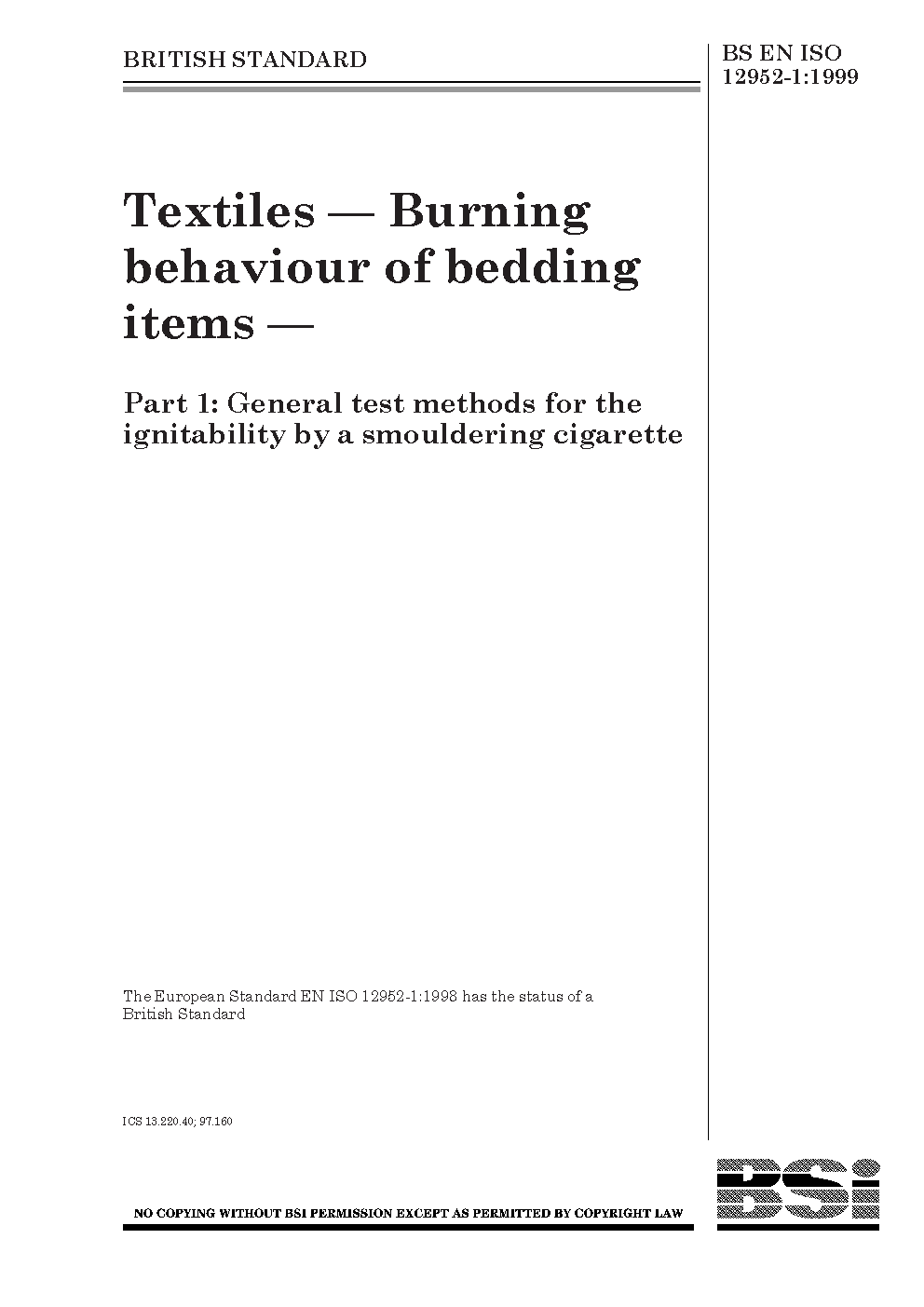 Textiles. Assessment of the ignitability bedding items Ignition source. Smouldering cigarette
