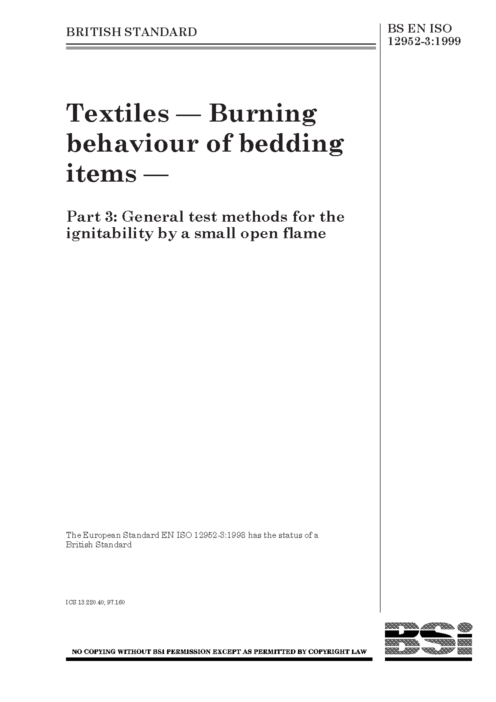 Textiles. Burning behaviour of bedding items General test methods for the ignitability by a small open flame