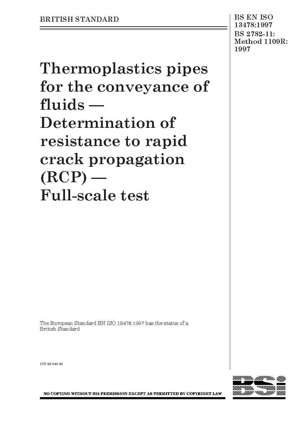 Thermoplastics pipes for the conveyance of fluids. Determination of resistance to rapid crack propagation (RCP). Full-scale test (FST)