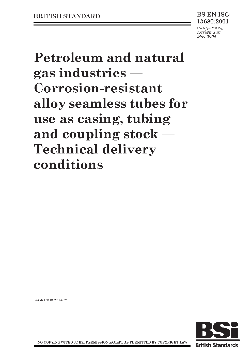 Petroleum and natural gas industries. Corrosion-resistant alloy seamless tubes for use as casing, tubing and coupling stock. Technical delivery conditions