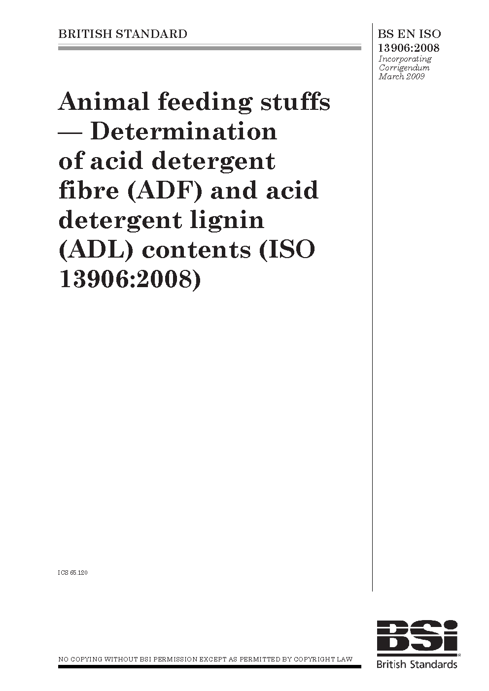 Animal feeding stuffs. Determination of acid detergent fibre (ADF) and acid detergent lignin (ADL) contents