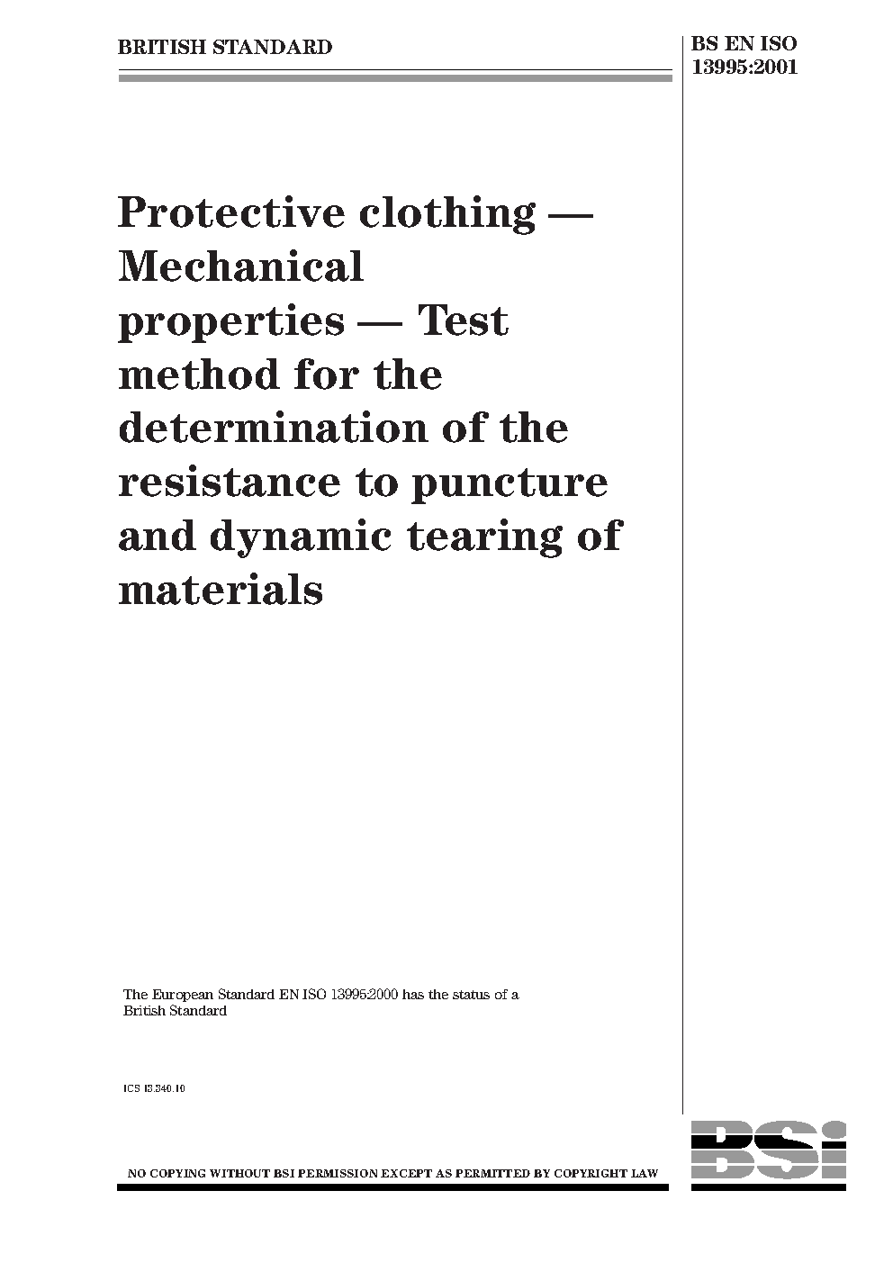 Protective clothing. Mechanical properties. Test method for the determination of the resistance to puncture and dynamic tearing of materials