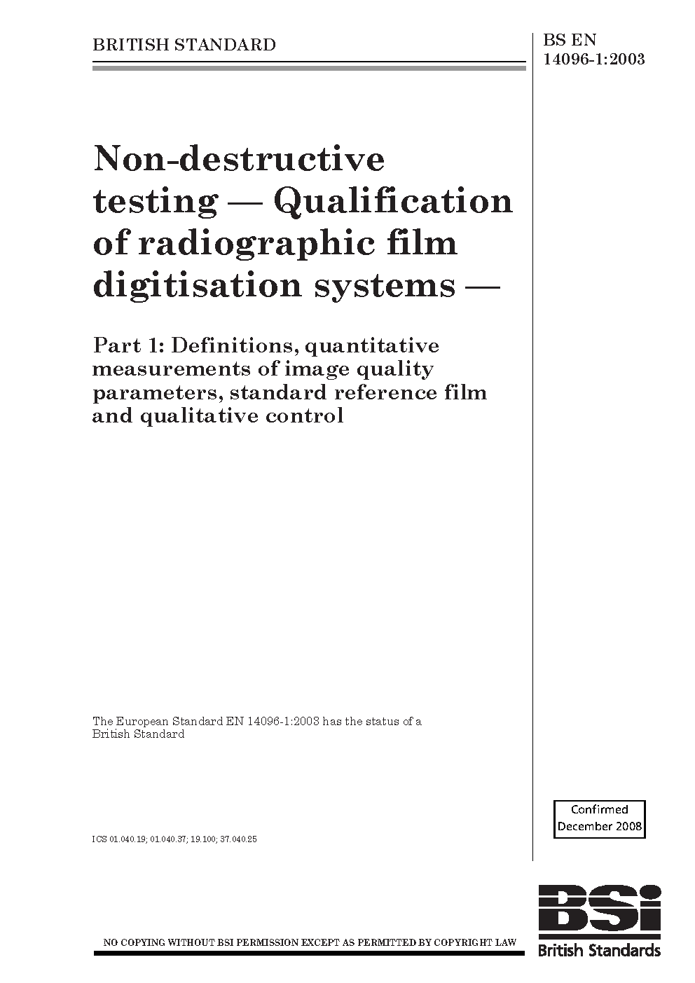 Non-destructive testing. Qualification of radiographic film digitisation systems Definitions, quantitative measurements image quality parameters, standard reference and qualitative control