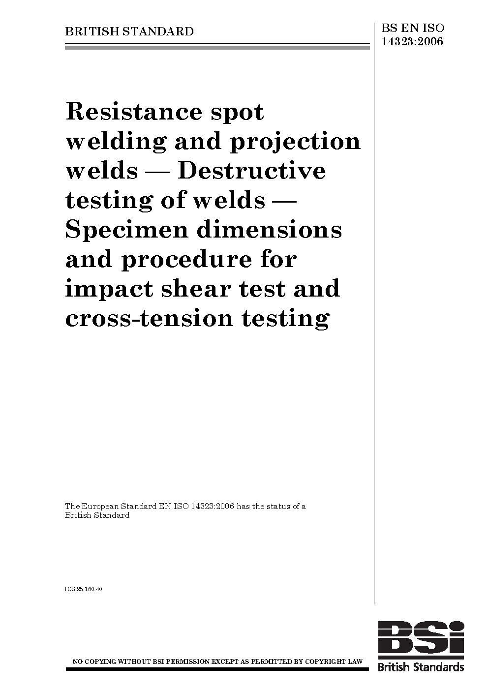 Resistance spot welding and projection welds. Destructive testing of welds. Specimen dimensions and procedure for impact shear test and cross-tension testing