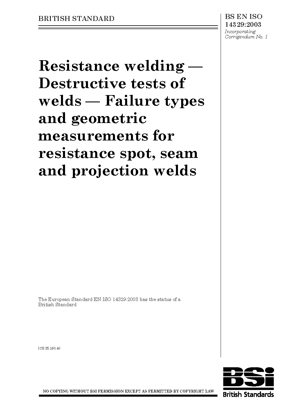 Resistance welding. Destructive tests of welds. Failure types and geometric measurements for resistance spot, seam and projection welds