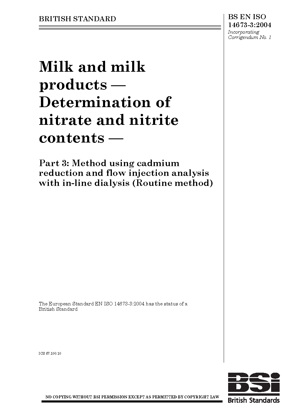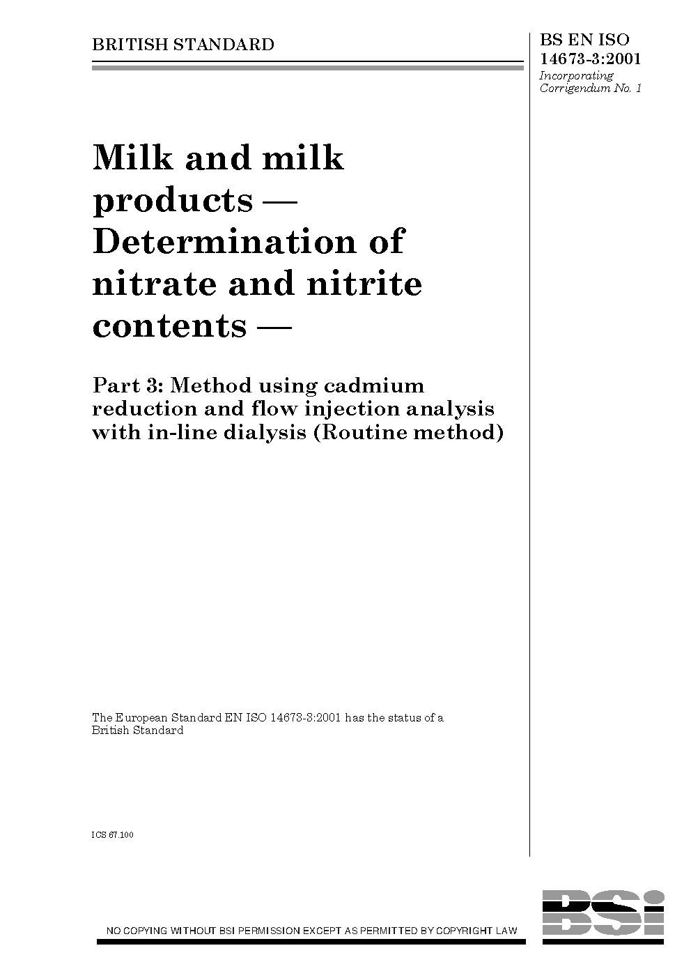 Milk and milk products. Determination of nitrate nitrite contents Method using cadmium reduction flow injection analysis with in-line dialysis (Routine method)
