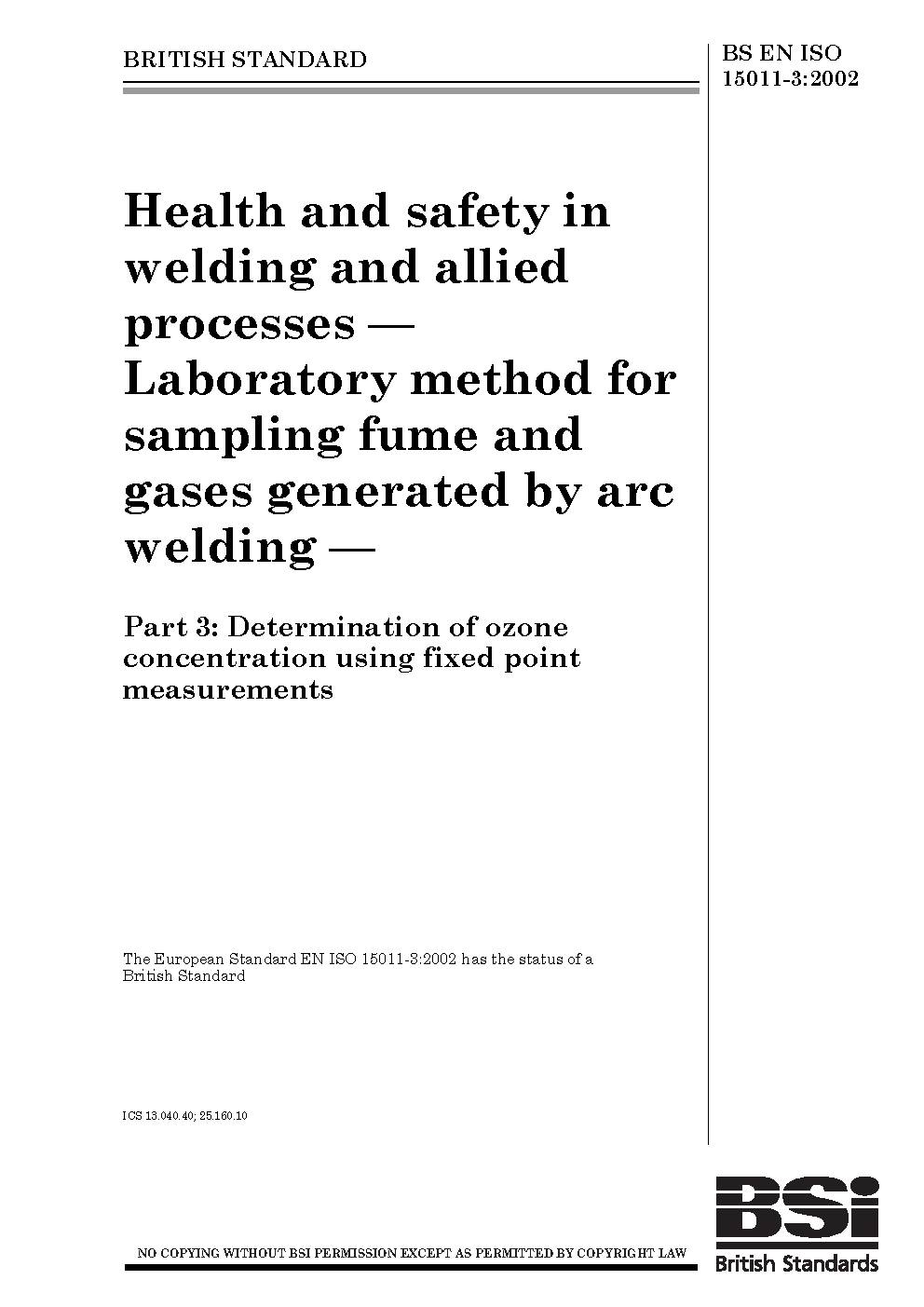 Health and safety in welding allied processes. Laboratory method for sampling fume gases Determination of ozone emission rate during arc