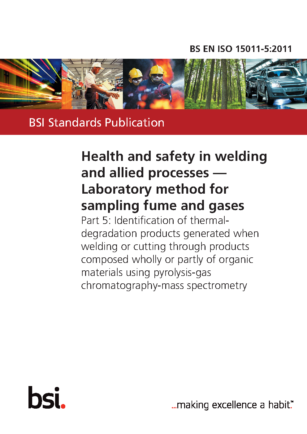 Health and safety in welding allied processes. Laboratory method for sampling fume gases Identification of thermal-degradation products generated when or cutting through composed wholly partly organic materials using pyrolysis-gas chromatography-mass spectrometry