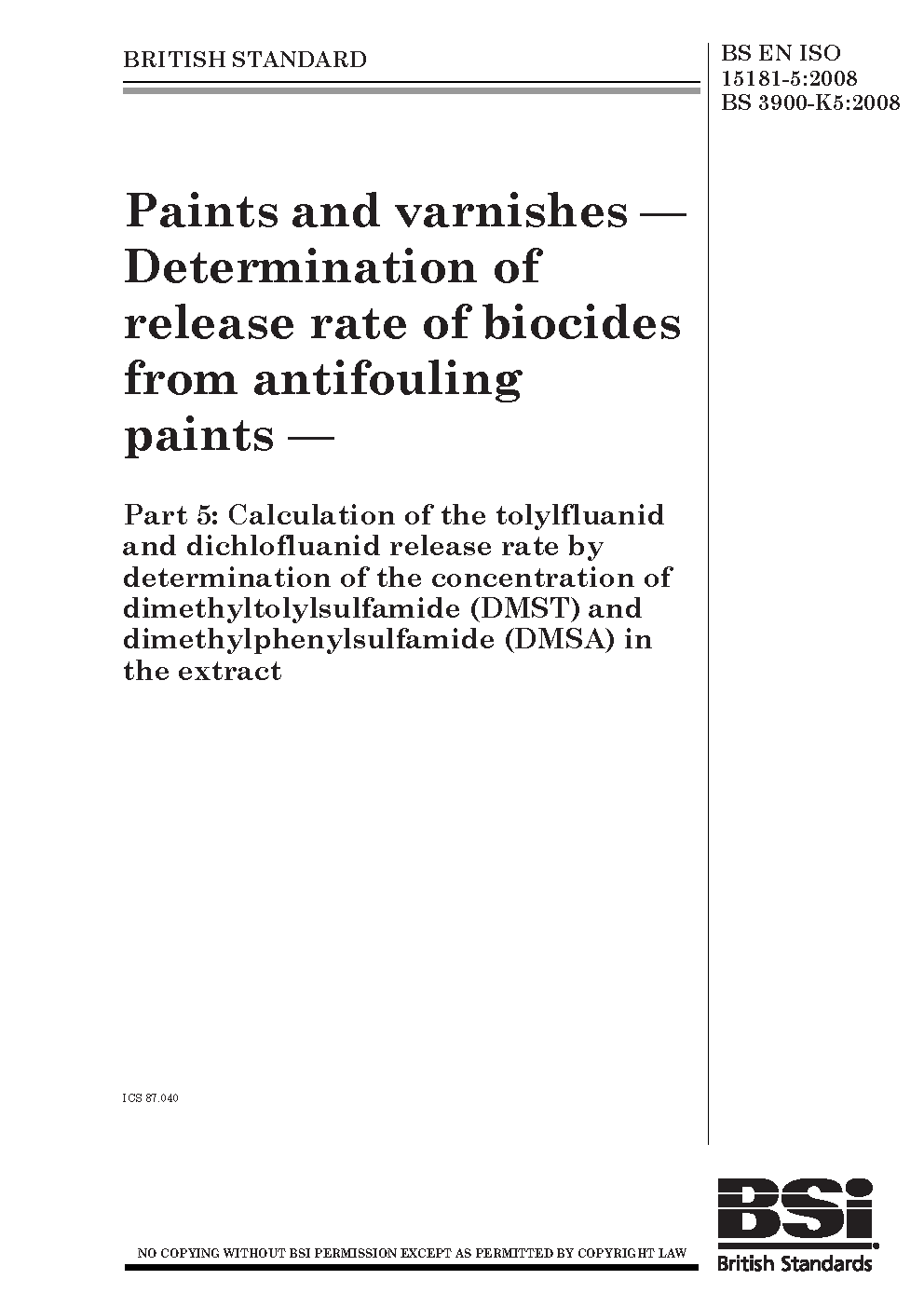 Paints and varnishes. Determination of release rate biocides from antifouling paints Calculation the tolylfluanid dichlofluanid by determination concentration dimethyltolylsulfamide (DMST) dimethylphenylsulfamide (DMSA) in extract