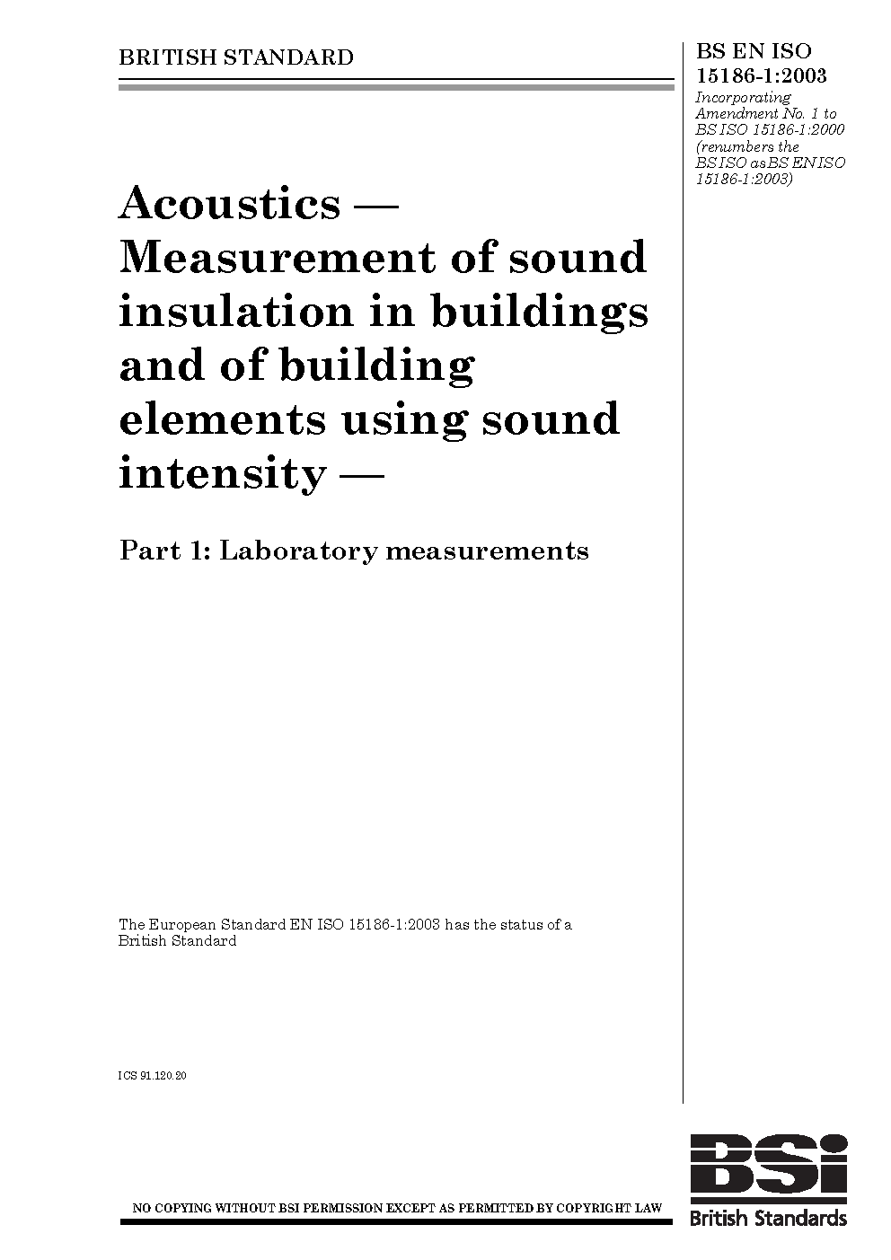Acoustics. Measurement of sound insulation in buildings and building elements using intensity Laboratory measurements