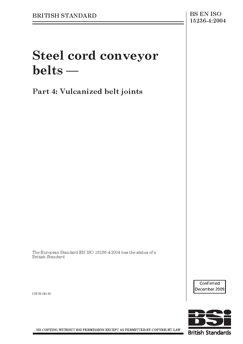 Vulcanized materials;Conveyor belts;Joints;Materials handling equipment;Cords;Materials handling components;Design;Mechanical properties of materials;Load-supporting devices;Dimensions;Steels