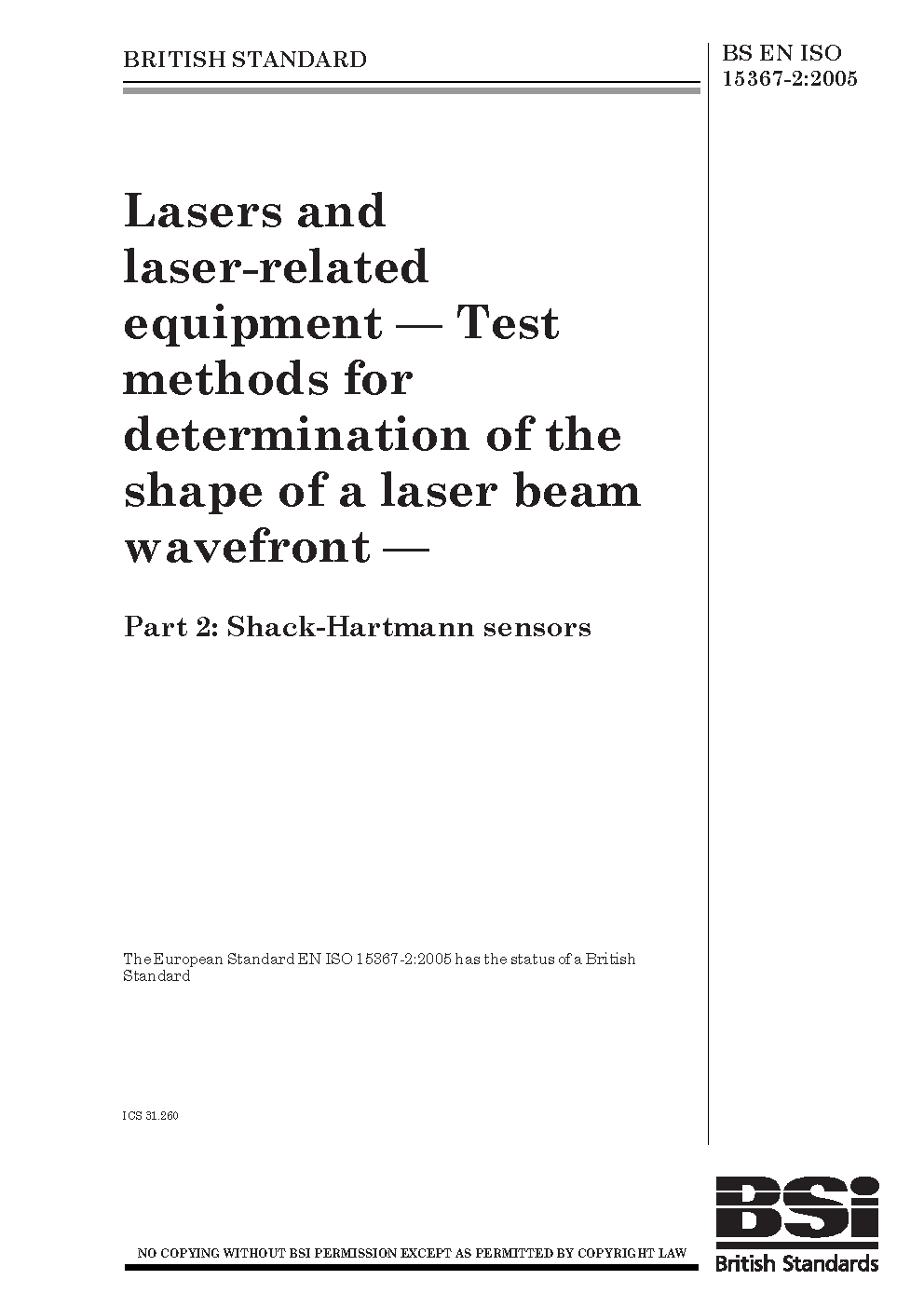 Lasers and laser-related equipment. Test methods for determination of the shape a laser beam wavefront Shack-Hartmann sensors