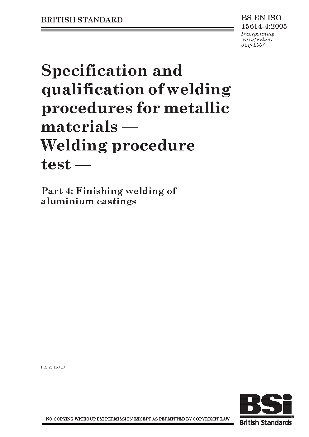 Specification and qualification of welding procedures for metallic materials. Welding procedure test Finishing aluminium castings