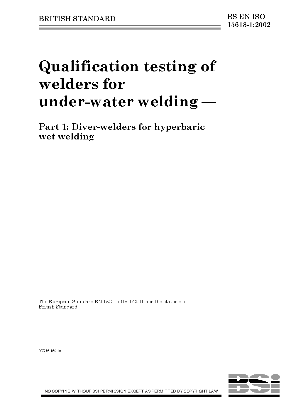 Qualification testing of welders for under-water welding Diver-welders hyperbaric wet