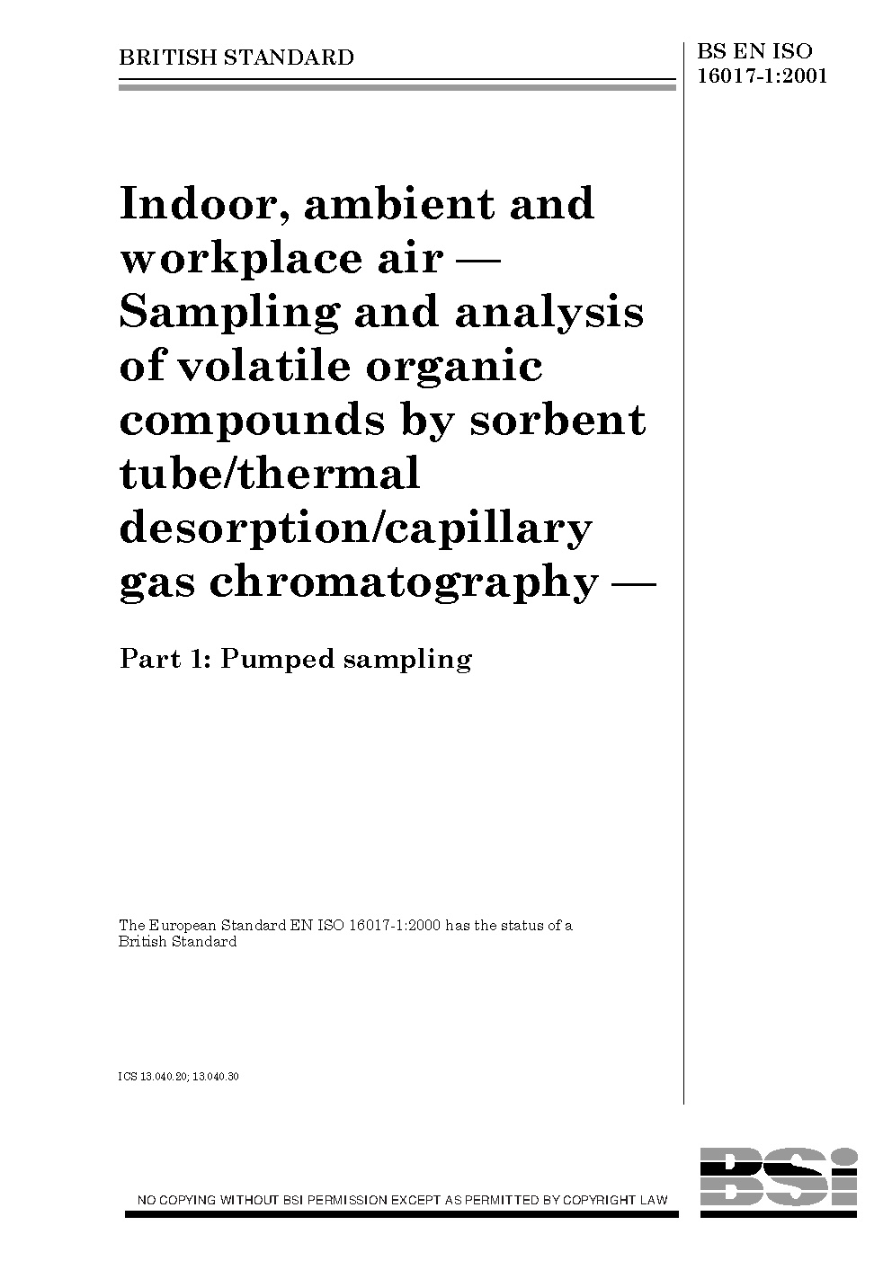 Indoor, ambient and workplace air. Sampling analysis of volatile organic compounds by sorbent tube/thermal desorption/capillary gas chromatography Pumped sampling