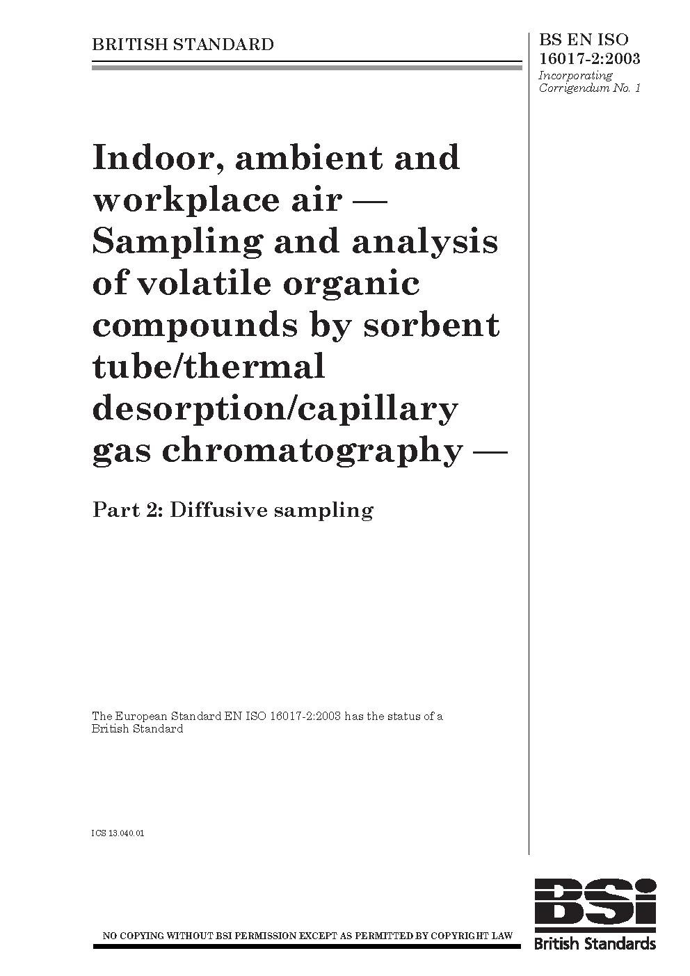 Indoor, ambient and workplace air. Sampling analysis of volatile organic compounds by sorbent tube/thermal desorption/capillary gas chromatography Diffusive sampling