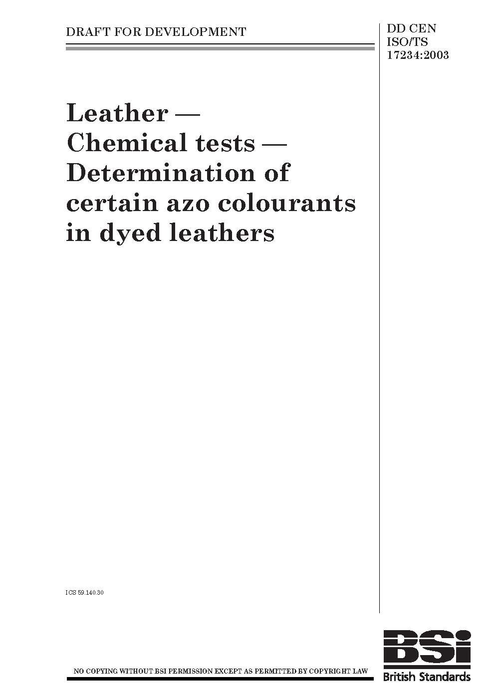 Leather. Chemical tests for the determination of certain azo colorants in dyed leathers Determination aromatic amines derived from