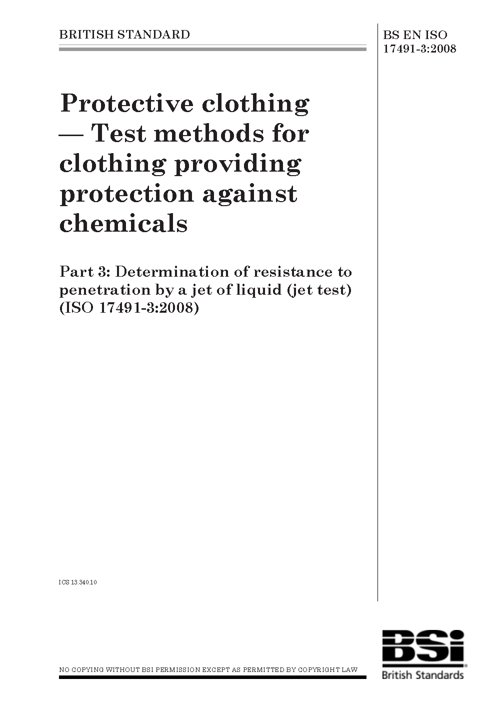 Protective clothing. Test methods for clothing providing protection against chemicals Determination of resistance to penetration by a jet liquid (jet test)