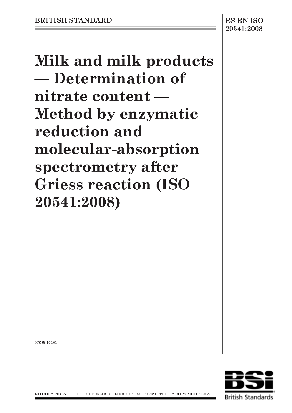Milk and milk products. Determination of nitrate content. Method by enzymatic reduction and molecular- absorption spectrometry after Griess reaction