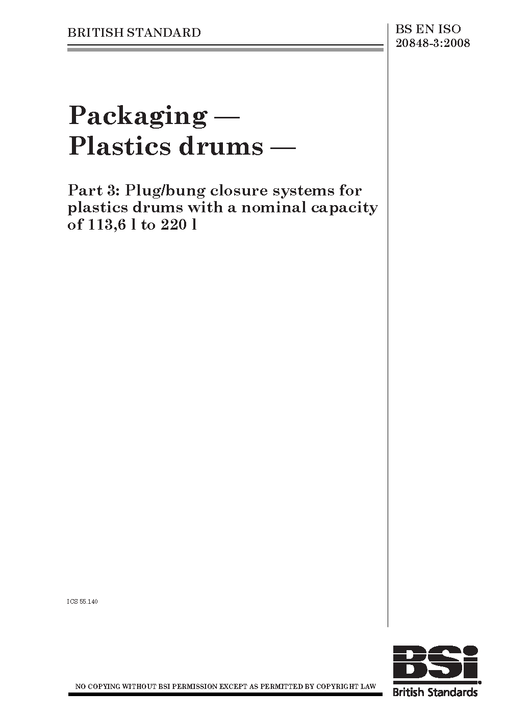 Packaging. Plastics drums Plug/bung closure systems for plastics with a nominal capacity of 113,6 l to 220