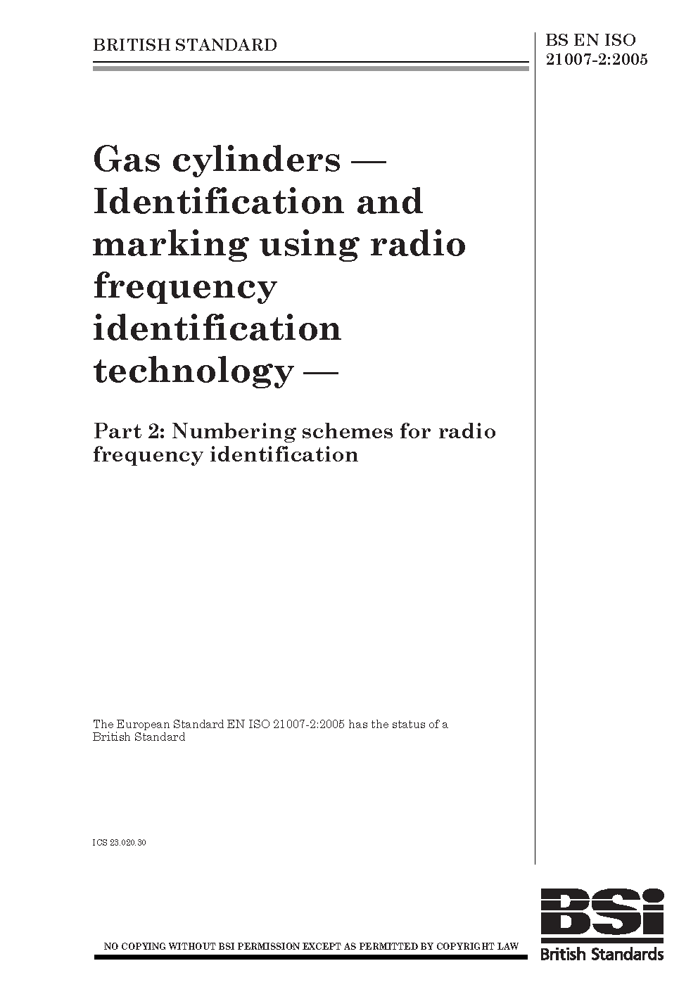 Gas cylinders. Identification and marking using radio frequency identification technology Numbering schemes for